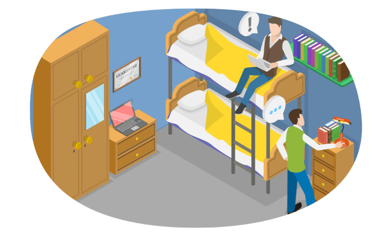 Менше приватності: кімната зазвичай на 2–3 людини, спільна кухня та санвузол.